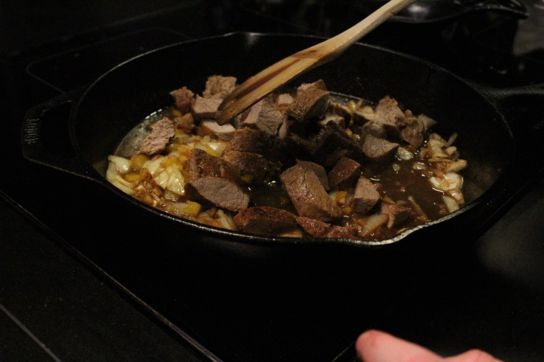 Ensuite, j’ai retiré la viande pour pouvoir la couper, puis j’ai ajouté l’oignon et le poivron. Une fois ma viande hachée, je l’ai remise dans le chaudron avec de l’eau, et j’ai laissé cuire un bout de temps. J’ai probablement ajouté de petites quantités d’eau environ 10 fois durant tout le processus.
