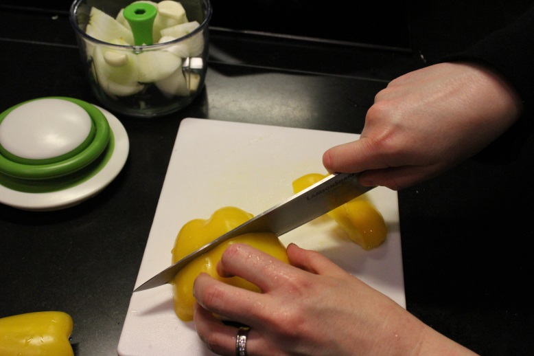 Après avoir assaisonné la viande, j’ai coupé mes oignons, mon poivron et mon ail. Avant, je coupais mes légumes entièrement à la main, mais maintenant j’utilise ce hachoir manuel de 20 piastres. J’aime tellement ce hachoir que j’en ai acheté un pour ma mère et mon beau-père pour Noël.